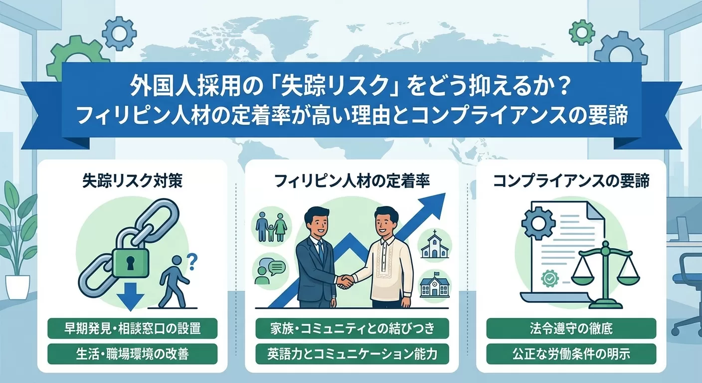外国人採用の「失踪・トラブル」を未然に防ぐ:フィリピン人材の国民性とコンプライアンスを重視した安定雇用の秘訣 日本国内の深刻な労働力不足を背景に、外国人採用を検討する企業が急増しています。しかし、経営者や人事担当者の皆様 […]