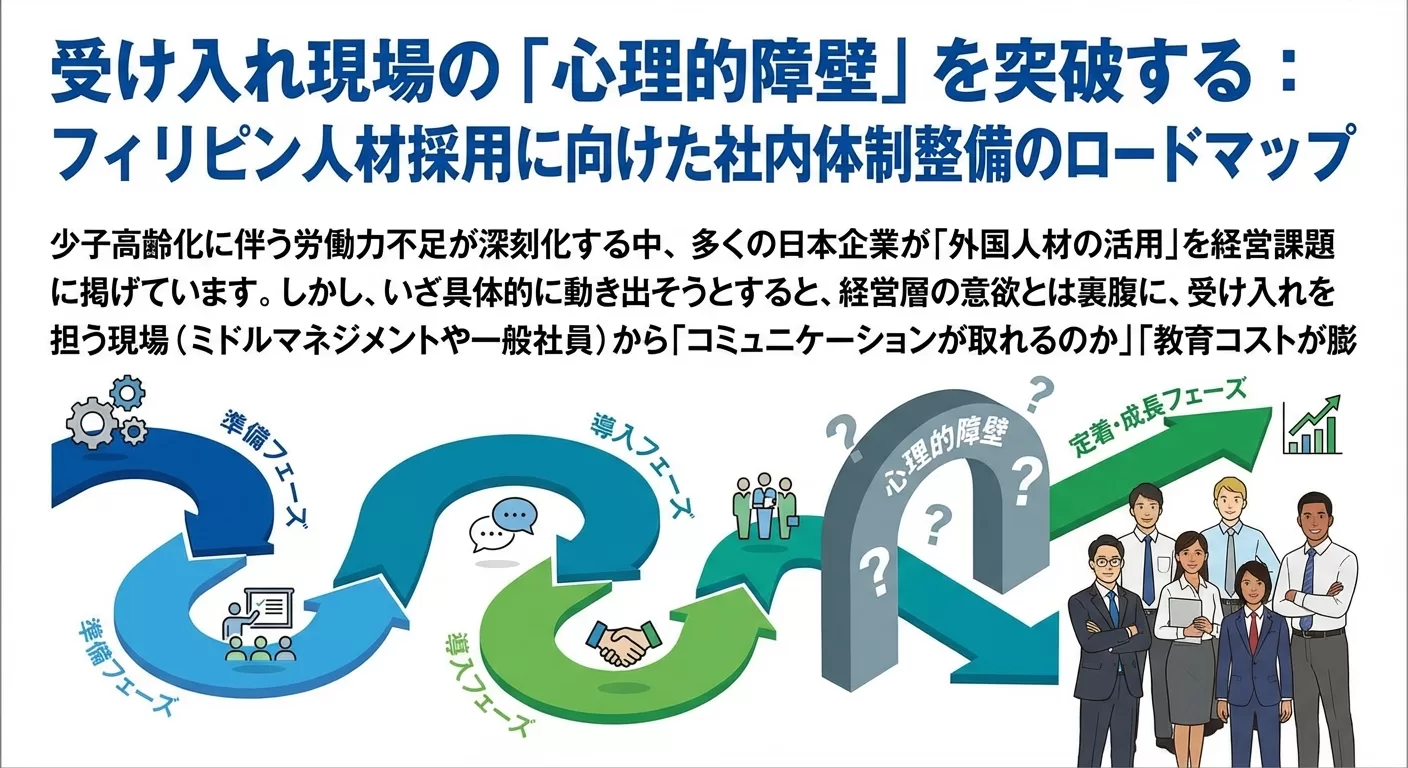受け入れ現場の「心理的障壁」を突破する:フィリピン人材採用に向けた社内体制整備のロードマップ 少子高齢化に伴う労働力不足が深刻化する中、多くの日本企業が「外国人材の活用」を経営課題に掲げています。しかし、いざ具体的に動き […]