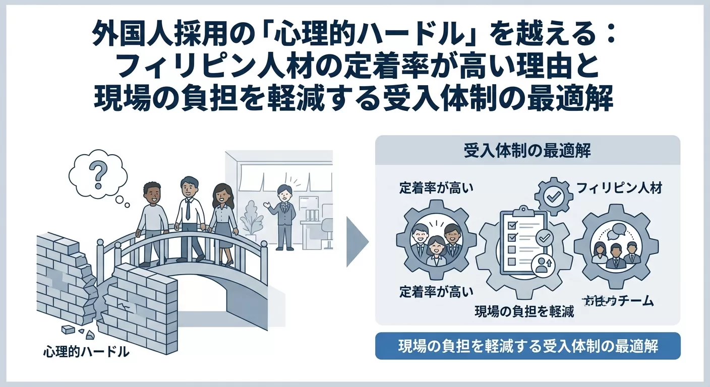 既存社員の「不安」を「期待」へ変える:フィリピン人材採用で現場の摩擦をゼロにするための受入体制構築ガイド 少子高齢化に伴う労働力不足を背景に、多くの日本企業が外国人材の採用を検討しています。しかし、経営層が「採用」を決断 […]