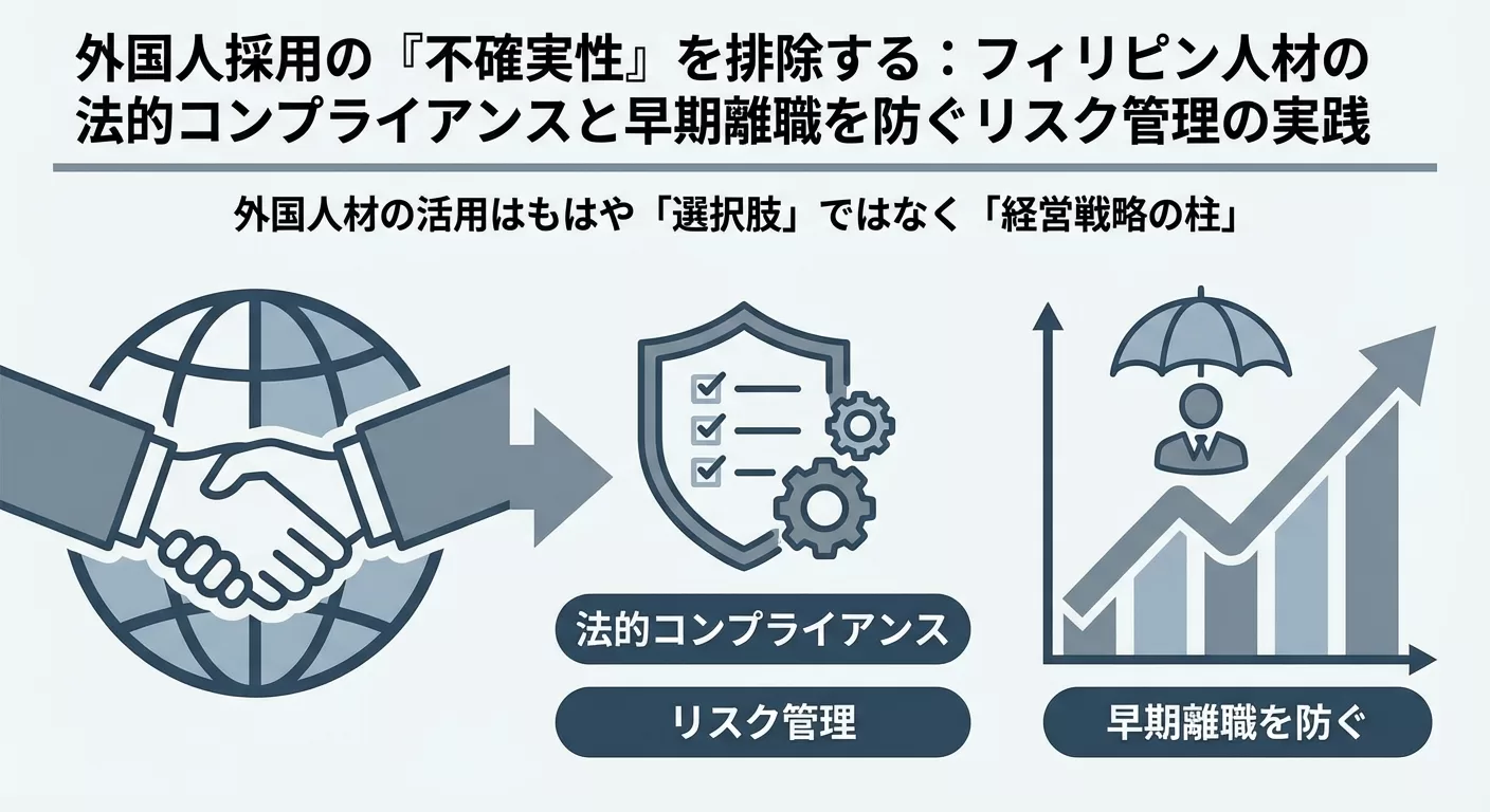 「外国人採用の『不確実性』を排除する:フィリピン人材の法的コンプライアンスと早期離職を防ぐリスク管理の実践」 労働力不足が深刻化する日本市場において、外国人材の活用はもはや「選択肢」ではなく「経営戦略の柱」となりました。 […]