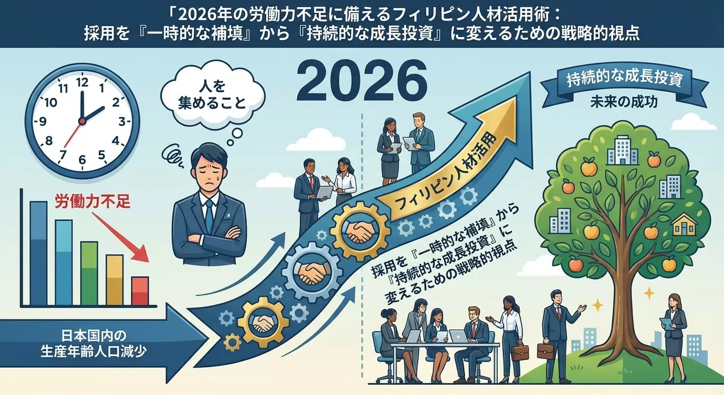 「2026年の労働力不足に備えるフィリピン人材活用術:採用を『一時的な補填』から『持続的な成長投資』に変えるための戦略的視点」 日本国内の労働力不足は、もはや「予測」ではなく「確定した未来」です。特に2026年は、団塊ジ […]